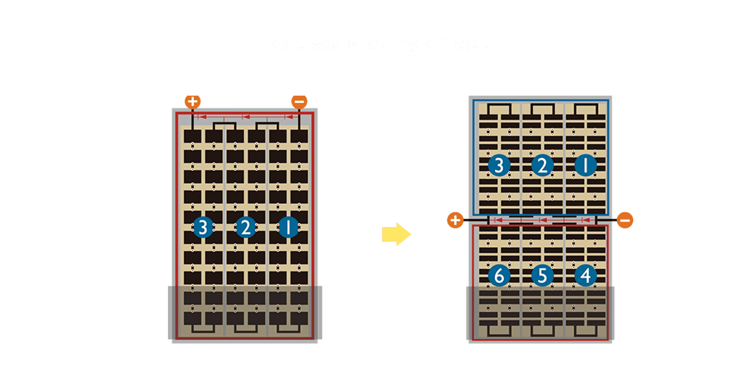 • 电池使用多条铜导线 (Copper wire) 于电池片上形成较短的电流路径,,,,提高电流收集效率,,,,采用圆形设计的铜导线较传统扁平式的铜焊带 (Ribbon),,可增加入射至电池的光线量。。。